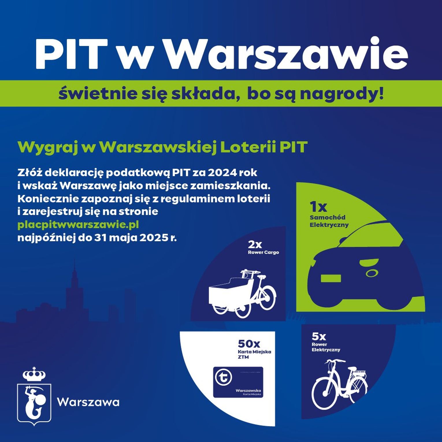 Miasto Stołeczne Warszawa po raz trzeci organizuje loterię "Płać PIT w Warszawie", zachęcając mieszkańców do rozliczania podatku dochodowego właśnie tutaj. W zamian oferuje szansę na wygranie atrakcyjnych nagród, w tym samochodu elektrycznego Fiat 500e Hatchback 23,8 kWh o wartości 122 847 zł brutto, rowerów cargo Triobike Hafnia o wartości 17 000 zł brutto każdy, rowerów elektrycznych ECOBIKE X-Cross o wartości 7 500 zł brutto każdy oraz 50 Warszawskich Kart Miejskich ZTM o wartości 600 zł brutto każda.