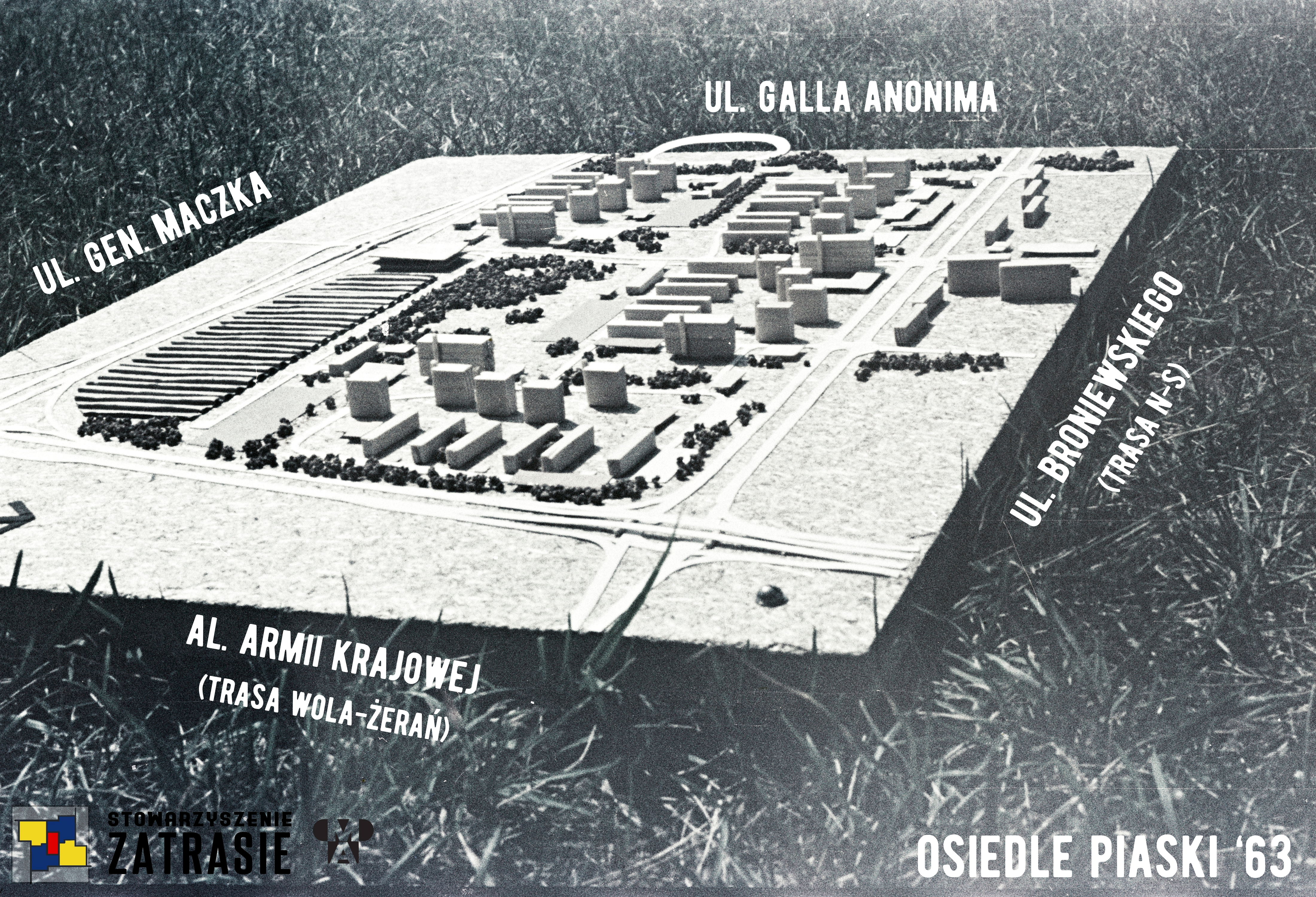 Pierwszy projekt Osiedla Piaski został opracowany już w 1963 r. przez zespół prof. Jacka Nowickiego. Osiedle zaprojektowano między planowaną trasą N-S (ul. Broniewskiego), planowaną trasą Wola - Żerań (al. Armii Krajowej), przedłużeniem ul. Powązkowskiej (dziś gen. Maczka) i ul. Galla Anonima. Przez środek całego układu przestrzennego miało przebiegać przedłużenie ul. Podczaszyńskiego (dziś Rudnickiego). Droga dzieliła projekt na dwa mniejsze osiedla, na których miały powstać po dwa mniejsze zespoły. Było to osiedle zaprojektowane dla 15 630 mieszkańców na terenie o powierzchni niespełna 31 hektarów. Osiedle miało być kontynuacją doświadczeń z zaprojektowanego 3 lata wcześniej Osiedla WSM Zatrasie znajdujące się na Żoliborzu między ul. Broniewskiego - Krasińskiego - Przasnyska - Elbląska. W projekcie znalazły się 23 budynki mieszkalne XI-kondygnacyjne, a także 24 budynki V-kondygnacyjne. Budynki powtórzono z realizowanych w tym czasie na Zatrasiu. O ile projekt Osiedla Piaski był już znacznie skromniejszy z uwagi na ograniczoną liczbę typów budynków. Projekt Zatrasia zakładał budynki typu A, B, C i S. Budynkami typu A były punktowce, w których znajdowały się głównie mieszkania typu M-3 (2 pokoje z kuchnią), budynki typu B to klatkowce, w których znajdowały się głównie mieszkania typu M-4 (3 pokoje z kuchnią), budynki typu C to segmentowce o charakterystycznym uskokowym kształcie. Ten typ budynków można było usytuować w formie pojedynczych segmentów lub zestawionych ze sobą po 2, 3, 4, a nawet 5 segmentów. Znajdowały się w nich zarówno mieszkania M-4 jak i M-5. Ten typ budynku niestety nie zostal uwzglęniony na Piaskach. Natomiast ostatnim typem, który projektanci uwzględnili w tym projekcie to budynek typu S, czyli tzw. dom dla samotnych z charakterystycznymi wachlarzowymi schodami ewakuacyjnymi wzdłuż ściany szczytowej, w których znajdowały się mieszkania najmniejsze typu M-1 i M-2. Były to kawalerki o powierzchni 19 i 29 mkw.