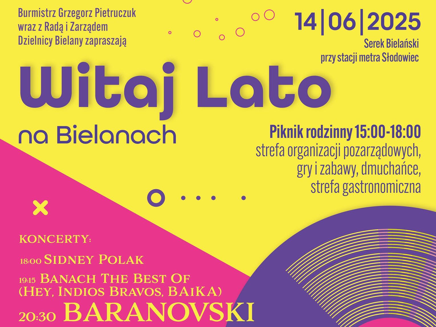 Wieczorem serek bielański zamieni się w muzyczne centrum Bielan. O godzinie 18:00 na scenie koncertowej wystąpi Sidney Polak, znany z energetycznych występów i hitów łączących reggae, hip-hop i rock. O 19:15 rozpocznie się koncert Banach The Best Of, który zabierze publiczność w sentymentalną podróż przez najważniejsze utwory zespołów Hey, Indios Bravos oraz Baiki. Na zakończenie dnia, około godziny 20:30, scenę przejmie BARANOVSKi – artysta młodego pokolenia, którego przeboje idealnie wpisują się w letni klimat.