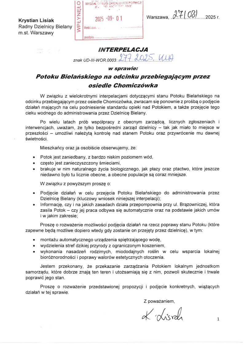 Zmiana zarządcy - tak brzmi główny postulat jaki wystosował w swojej interpelacji radny Krystian Lisiak (RDB). W dokumencie złożonym 27 sierpnia członek Razem Dla Bielan wystosował prośbę o wszczęcie procedur w celu przejęcia potoku bielańskiego do administracji przez dzielnicę Bielany. Powodem reakcji radnego ma być niski poziom wód, śmieci i brak naturalnego życia biologicznego występującego niegdyś w potoku w rejonie osiedla Chomiczówka.