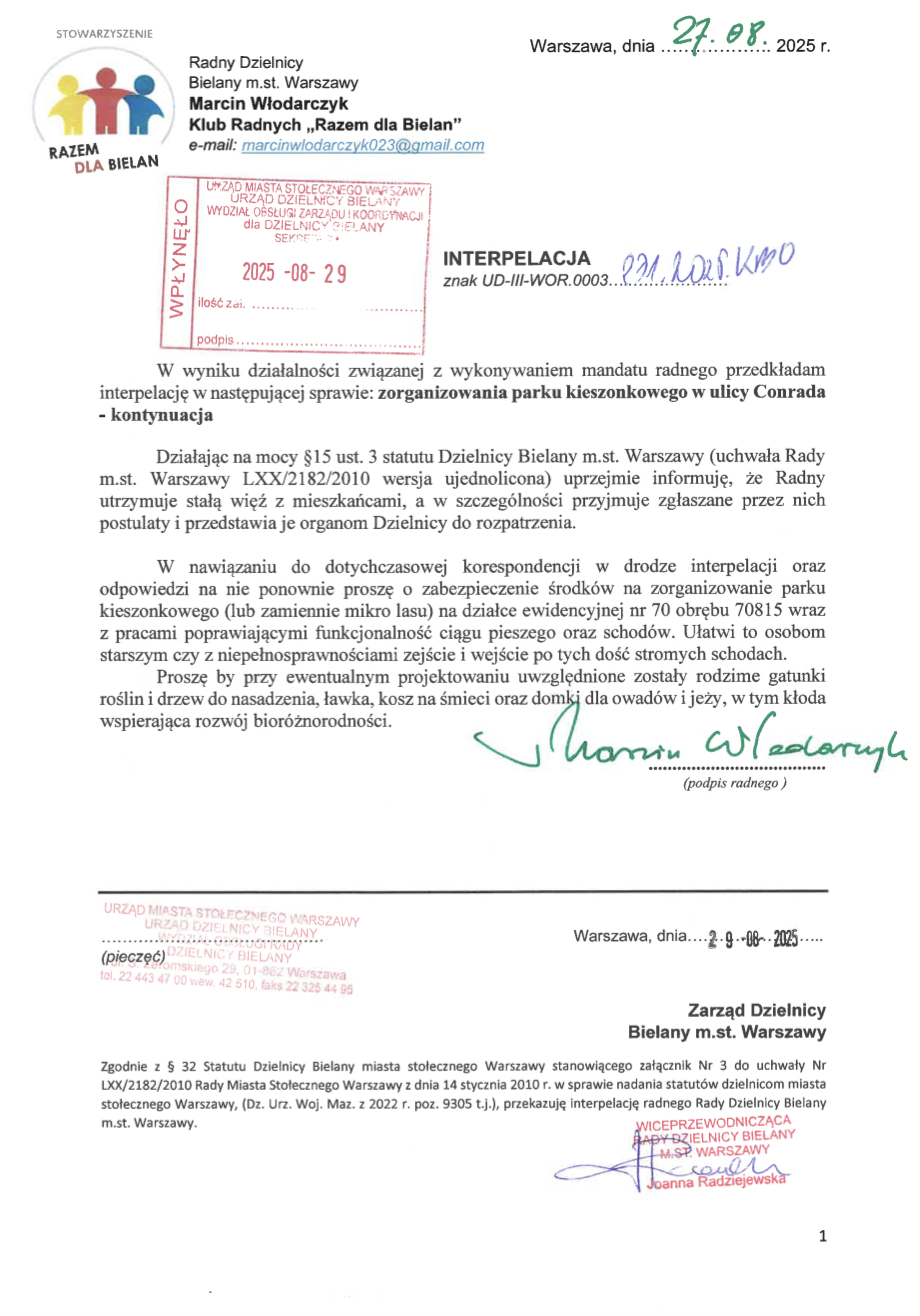 Choć w innym miejscu niż we wcześniejszych interpelacjach park przy ul. Conrada pojawił się jako projekt w budżecie obywatelskim na rok 2025, ale nie został wybrany. Autorem projektu był radny Krystian Lisiak. Projekt zakładał zazielenienie oraz małą architekturę. Podobne parki kieszonkowe zostały już wcześniej zrealizowane na Bielanach. Dwa z nich można znaleźć przy al. Reymonta oraz przy ul. Broniewskiego. Zazielenione skwery dobrze służą przy przystankach tramwajowych. Takie projekty z budżetu obywatelskiego to ja rozumiem. Dzięki głosom mieszkańców klepisko przy przystanku tramwajowym Piaski nabrało blasku - piszą zadowoleni internauci.