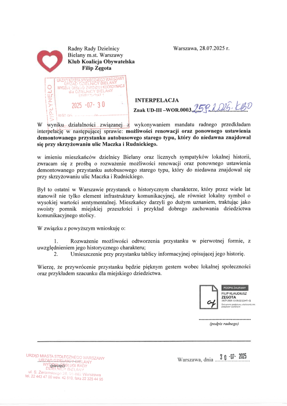 W sierpniu radny Filip Zęgota w sprawie przystanku złożył interpelację. W dokumencie przedstawił obiekt jako lokalny symbol o wysokiej wartości sentymentalnej. Zastępczyni burmistrza Sylwia Lacek przekazała interpelację do Zarządu Transportu Miejskiego. Z odpowiedzi ZTM wynika, że podjęto próby odtworzenia przystanku, jednak z uwagi na stan i zużycie elementów nośnych niemożliwe jest potwierdzenie, czy powróci do użytku. Uwzględniono również możliwość wykorzystania nowych rozwiązań technicznych, jeśli będzie to konieczne do zachowania konstrukcji.