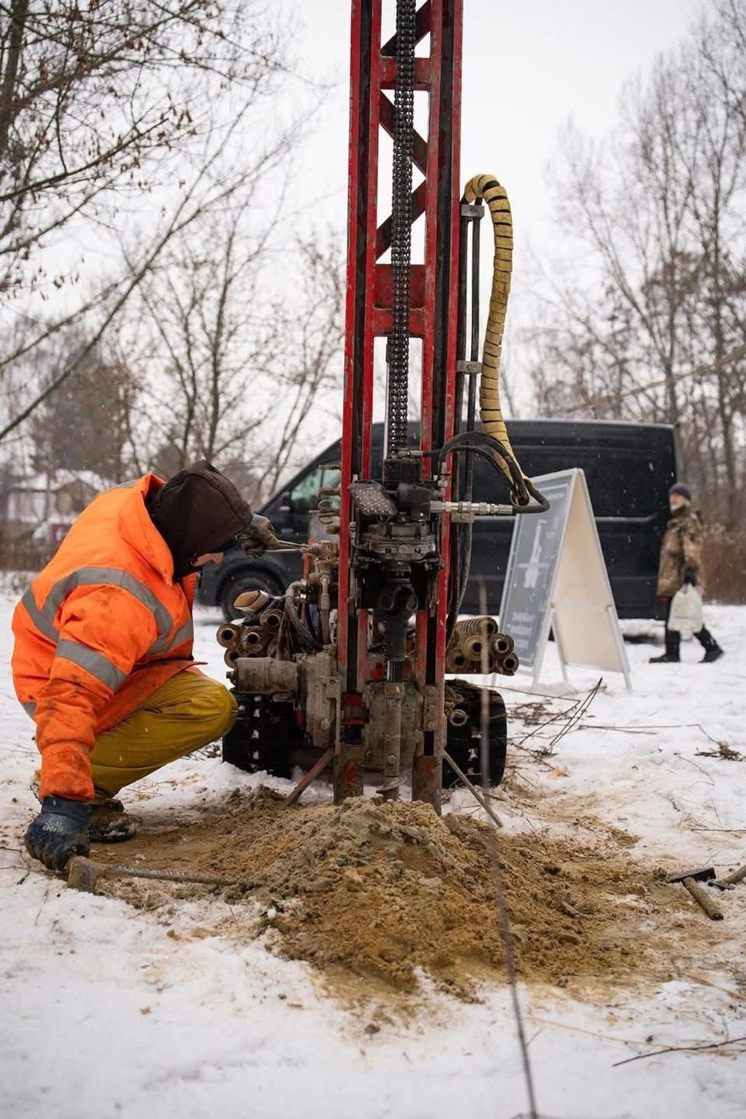 Odwierty to jeden z najważniejszych etapów prac przedprojektowych. Geolodzy pobierają tzw. rdzeń gruntowy, który pozwala dokładnie określić budowę podłoża. Próbki trafią do badań laboratoryjnych.