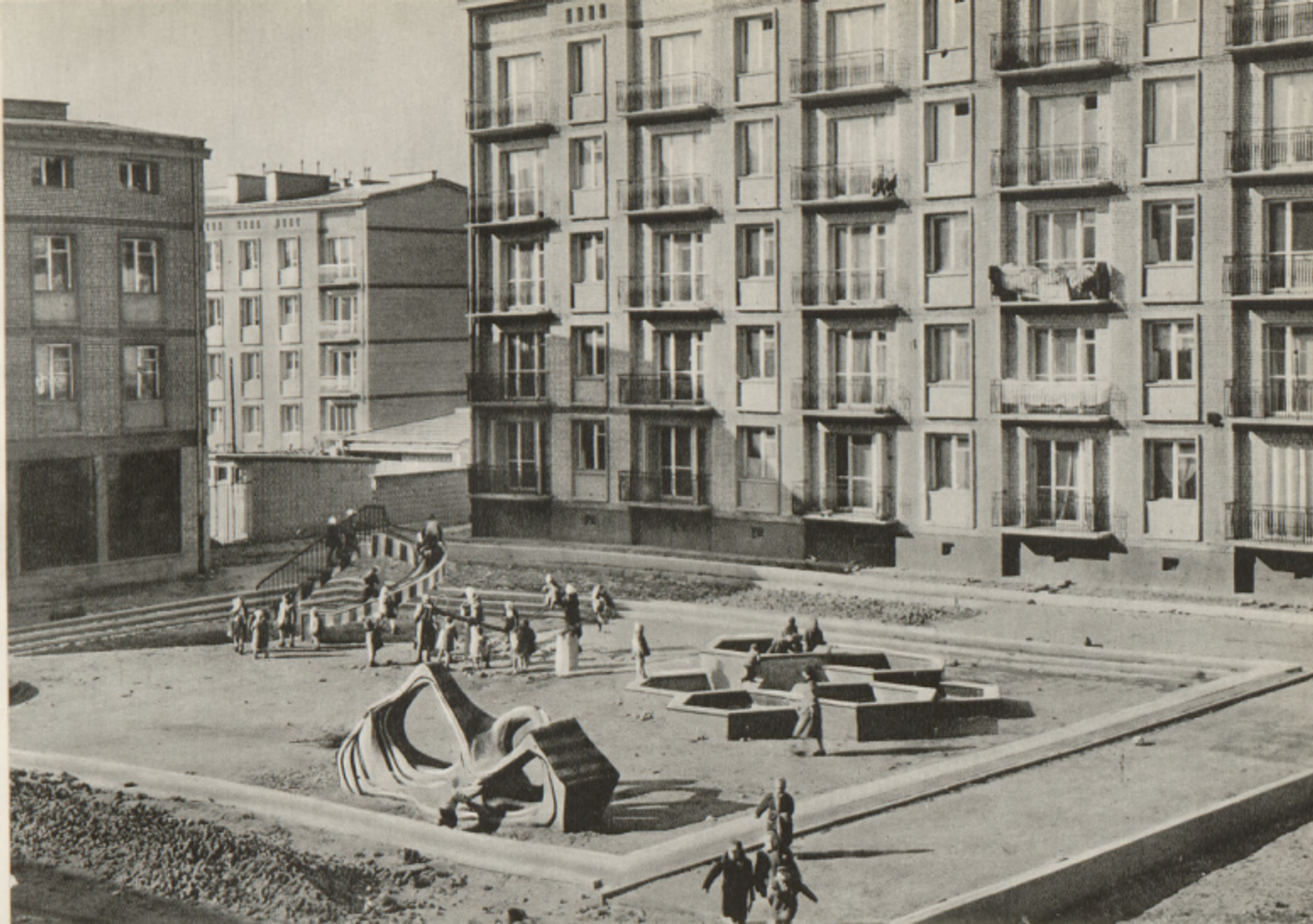 Centralną częścią zespołu jest duży plac zabaw, pierwotnie wyposażony w indywidualnie zaprojektowane urządzenia. Znajdowały się tam m.in. duża zjeżdżalnia z krętymi schodkami, chybotka oraz rozbudowana piaskownica składająca się z siedmiu połączonych modułów w kształcie plastrów miodu, rozmieszczonych na różnych wysokościach. Niestety, w wyniku modernizacji placu zabaw piaskownica została zniszczona i zastąpiona uproszczoną wersją. Drugi, podobny obiekt zachował się na osiedlu Bonifraterska na Muranowie, zaprojektowanym przez prof. Barbarę Andrzejewską-Urbanowicz wraz z zespołem. Do dziś przetrwała natomiast charakterystyczna przeplotnia, zwana „muszlą bielańską”.